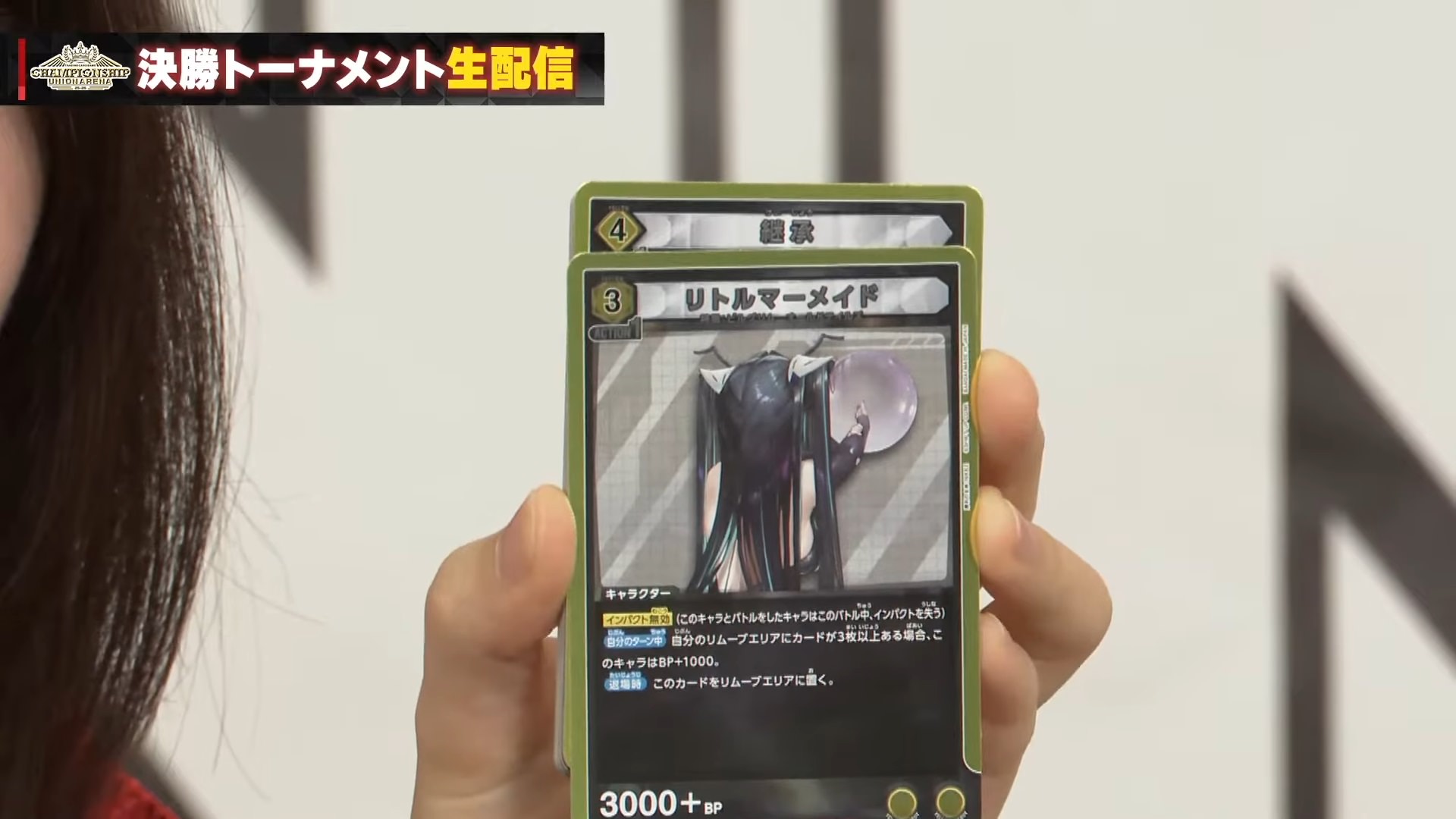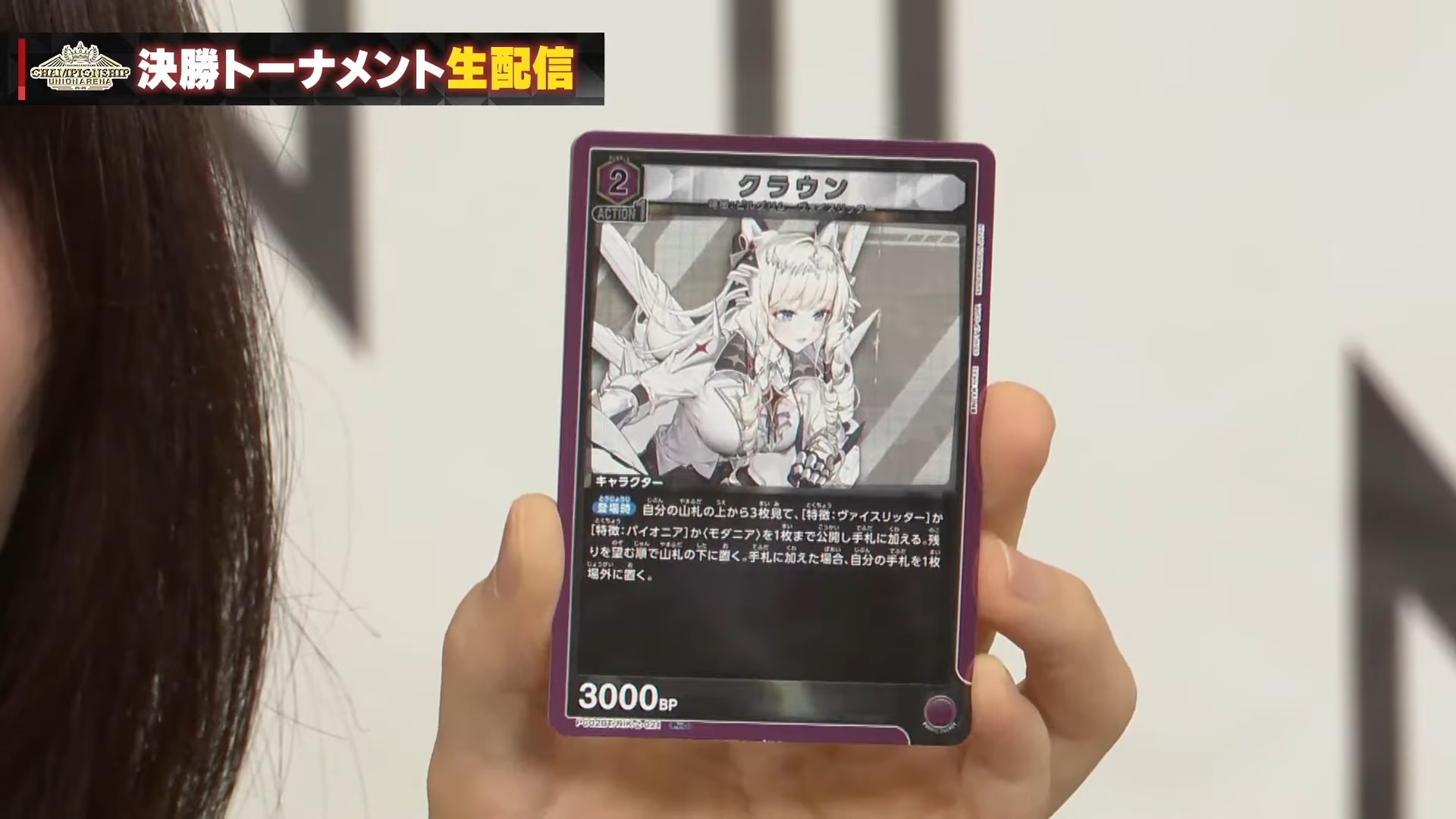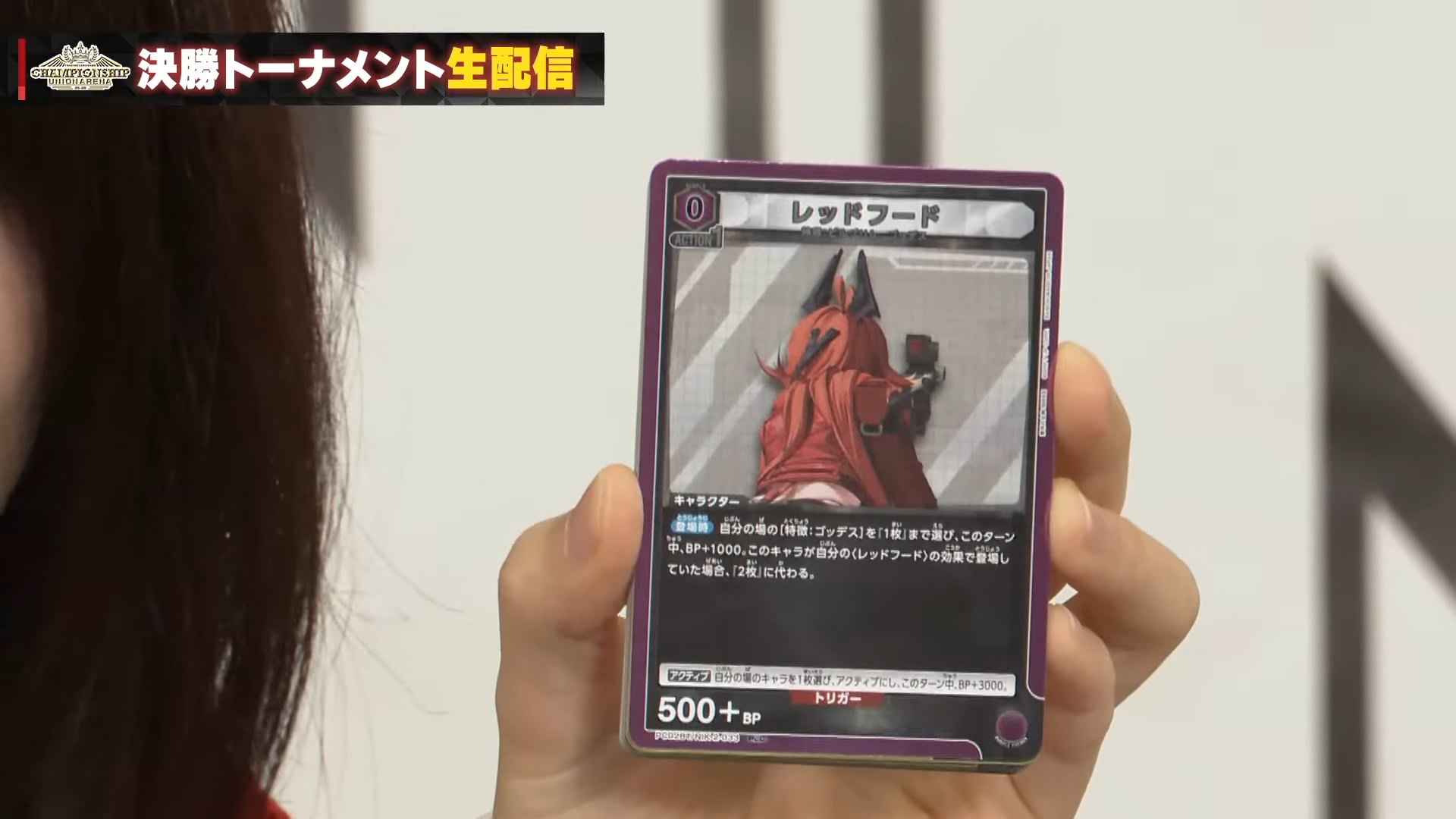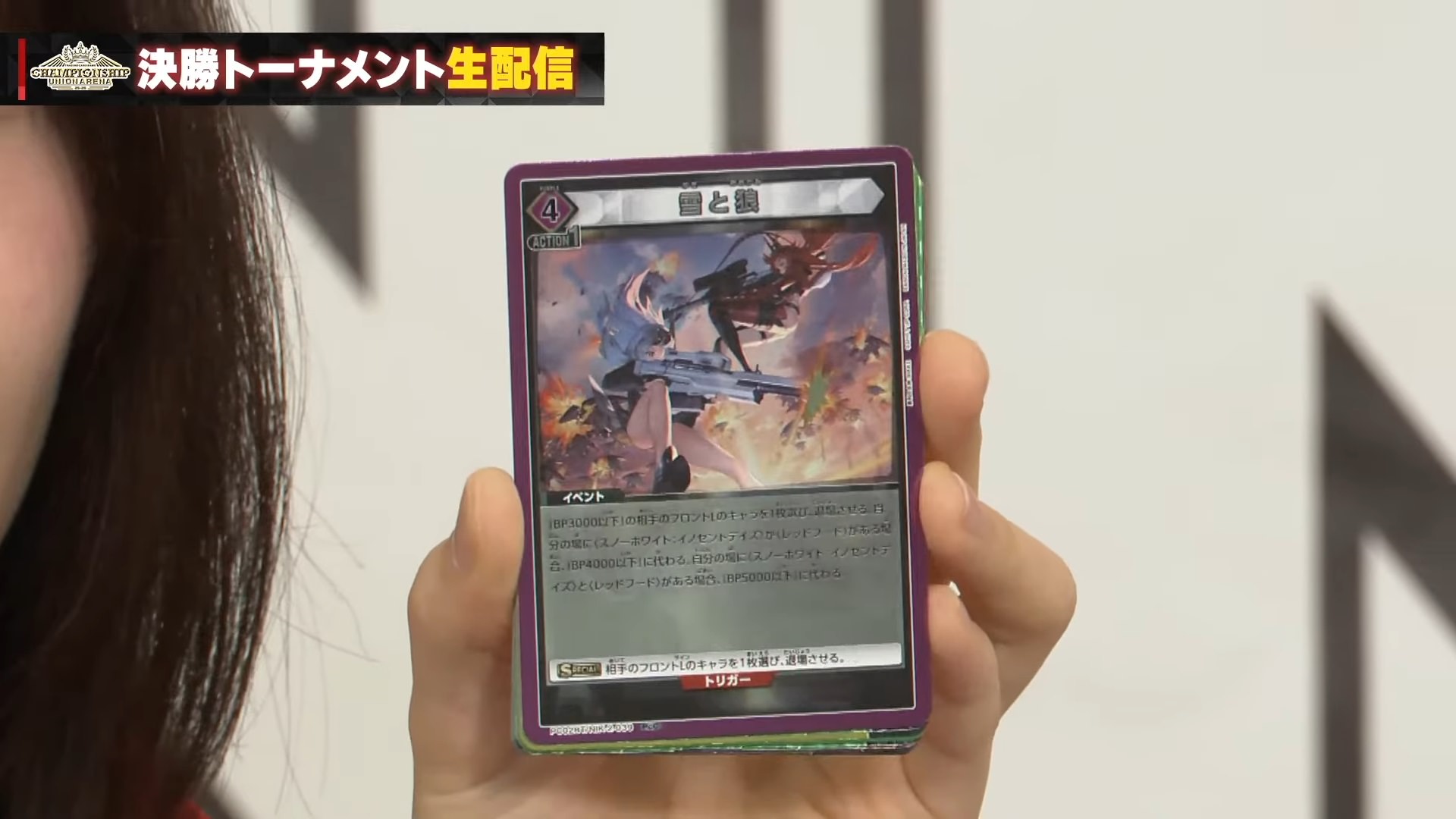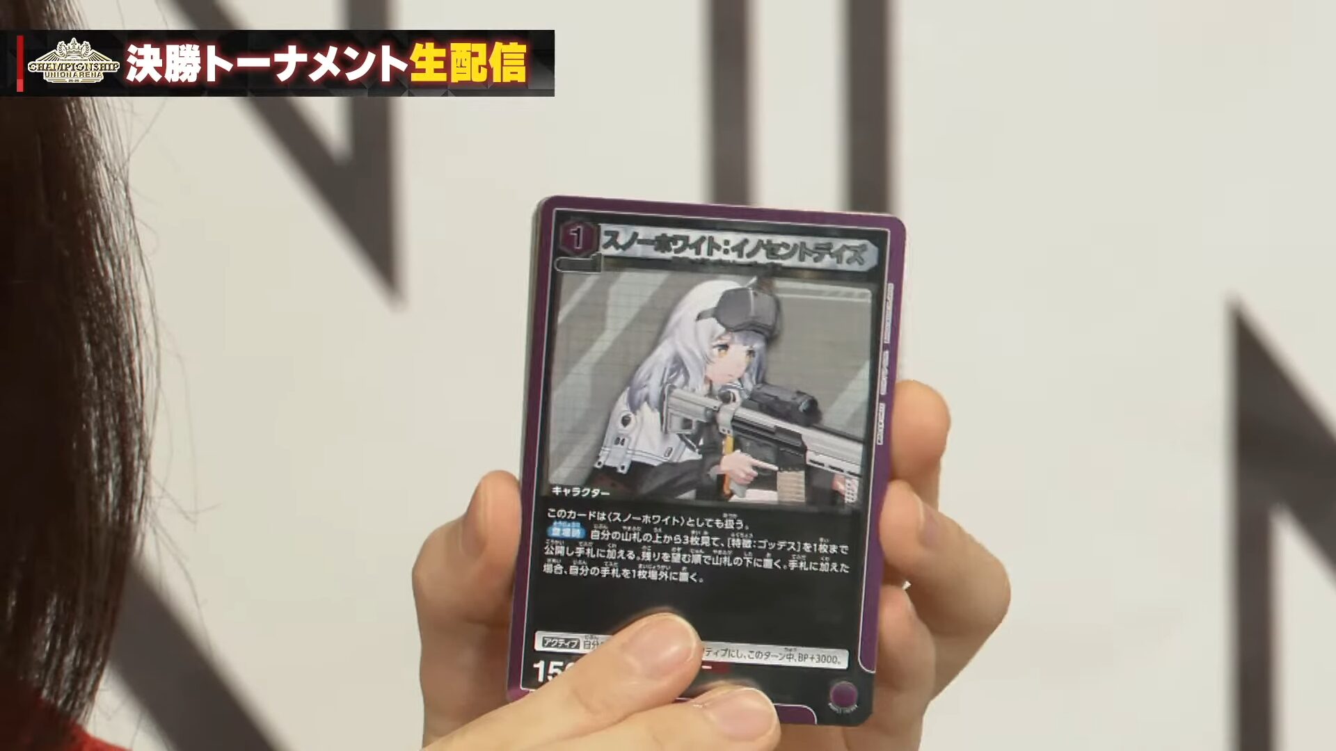 「BP3000以下」の相手のフロントLのキャラを1枚選び、退場させる。自分の場に<スノーホワイト:イノセントデイズ>が<レッドフード>がある場合「BP4000以下」に代わる。自分の場に<スノーホワイト:イノセントデイズ>と<レッドフード>がある場合、「BP5000以下」に代わる。