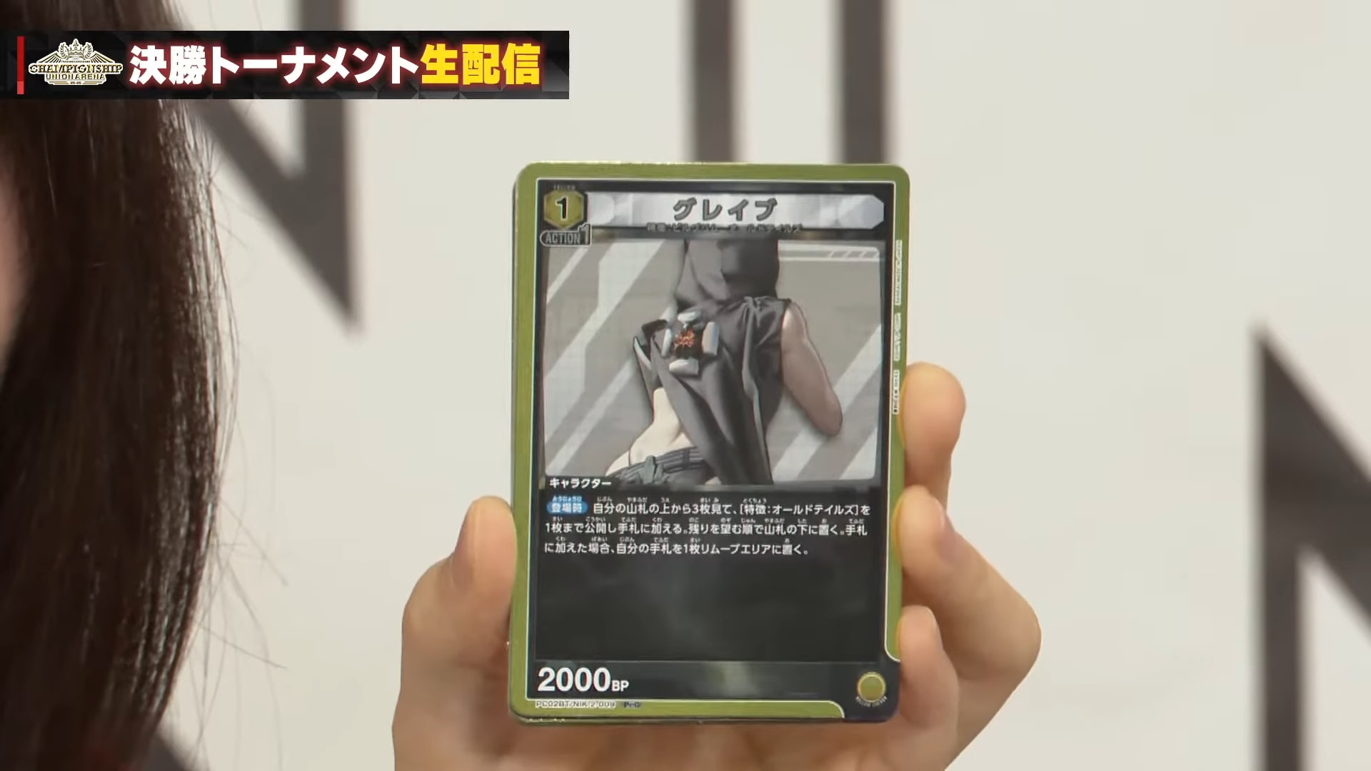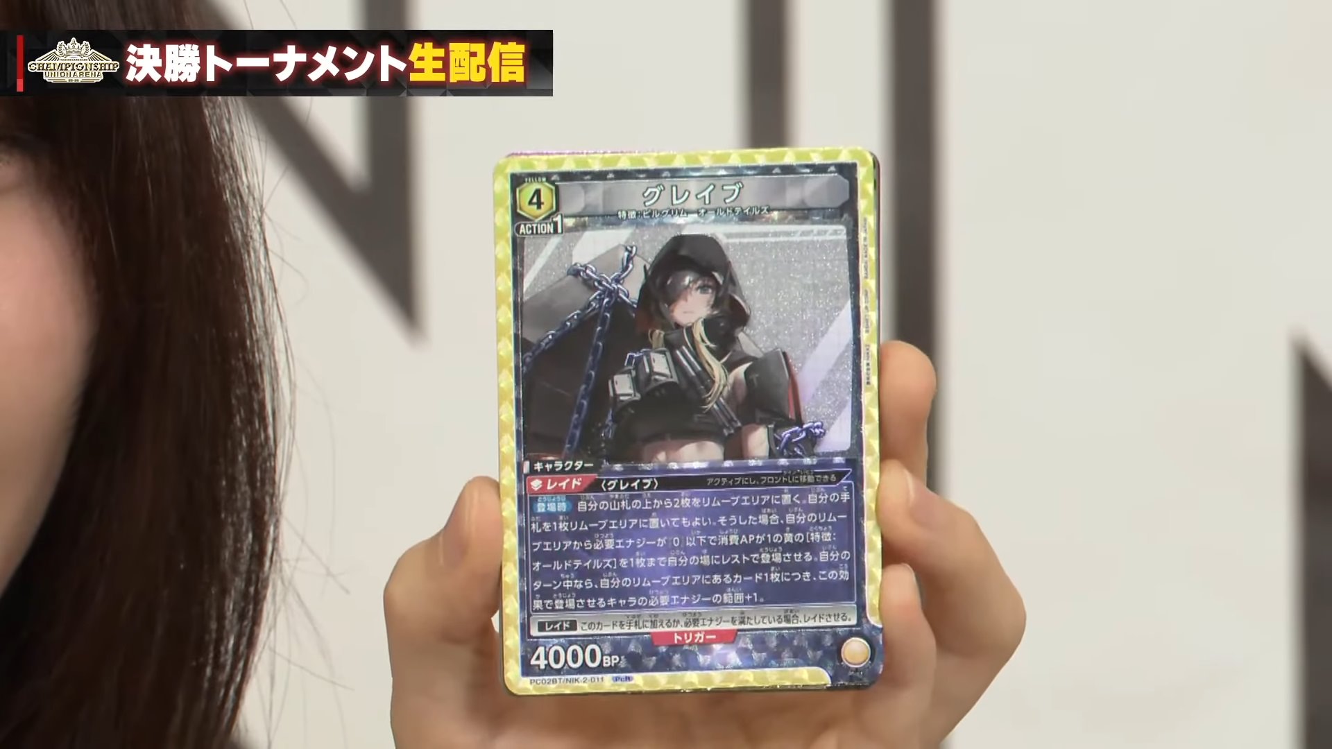 【登場時】自分の山札の上から2枚をリムーブエリアに置く。 自分の手札を1枚リムーブエリアに置いてもよい。そうした場合、自分のリムーブエリアから必要エナジーが「0」以下で消費APが1の黄の [特徴:オールドテイルズ] を1枚まで自分の場にレストで登場させる。自分のターン中なら、自分のリムーブエリアにあるカード1枚につき、この効果で登場させるキャラの必要エナジーの範囲+1。