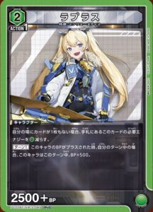 自分の山札の上から2枚見て、望む枚数を望む順で山札の上に置き、残りを場外に置く、自分の場外から必要エナジーが2以下の<ラピ>を1枚自分の場にアクティブで登場させてもよい。そうした場合、その<ラピ>をこのターン中、BP+2500し、このカードを裏向きでその<ラピ>の下に置く。