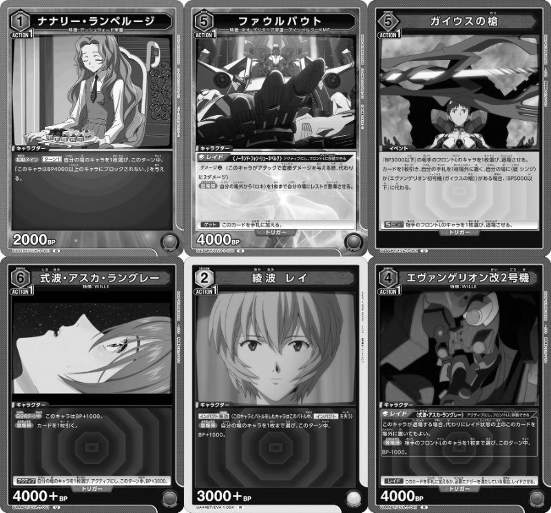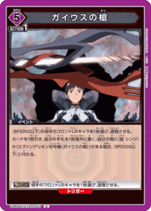 『ヱヴァンゲリヲン新劇場版』の通称「紫のガイウスの槍デッキ」において、「EVA-1-051 式波・アスカ・ラングレー」は、「EVA-1-033 エヴァンゲリオン初号機(ガイウスの槍)」と組み合わせてアクティブ状態で場に出すことができ、登場時にカードを引きながらBP5000でアタックが可能です。
