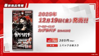 カグラバチ 【ユニオンアリーナ】『カグラバチ』現在判明しているカード一覧【ユニアリ】 『カグラバチ』現在判明しているカード一覧ブースターパック発売日2025年12月19日(金)メーカー希望小売価格385円(税込)内容内容・カード:8枚・1ボックス:16パック入種類数・SR(スーパーレア):10種・R(レア):12種・U(アン... 2025.11.10 カグラバチ